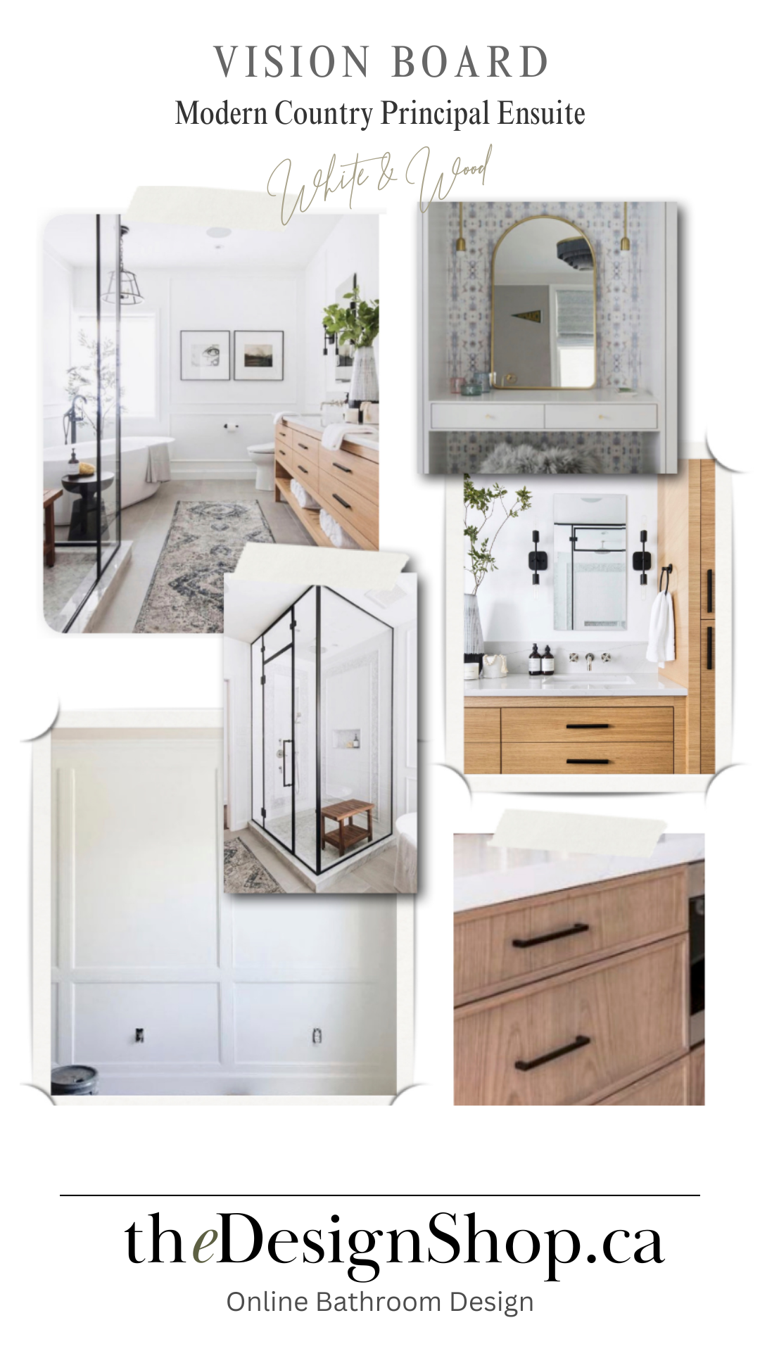 Here’s an example of a Vision Board and below that, the design solutions applied to an ensuite design, this shows where we started and where we ended up.